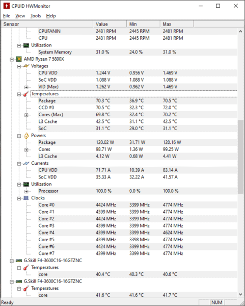 Selbst unter voller Belastung durch CineBench R23 bleibt die COU mit 70 °C noch hervorragend in einem guten Temperaturbereich, ohne einen Düsenjet im Rechner zu starten.