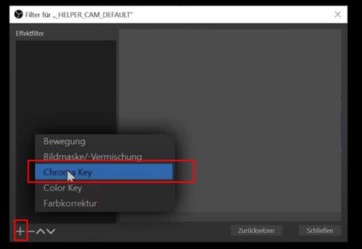 - Wenn sich das Fenster mit den Filtern geöffnet hat, füge einen Filter hinzu, indem du auf das kleine Plus-Zeichen unten links klickst und dann wähle den Filter „Chroma-Key“ aus.