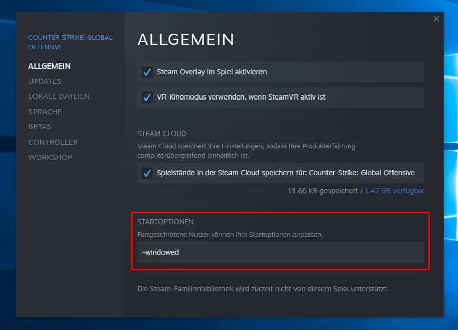 Bei Steam: Steamgames kannst du ganz einfach im Fenstermodus starten, indem du in deiner Steam-Library auf das Spiel rechts klickst und auf „Einstellungen“ klickst. Nun kannst du als Startoption „-windowed“ hinzufügen.