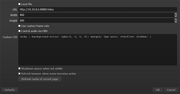 Die kopierte IP-Nummer kannst du nun in OBS, als Browser-Source einstellen. Klicke einfach auf das Plus um eine neue Quelle hinzufügen, wähle Browser-Source aus und kopiere die IP in das URL-Feld.- Im Browserfenster kannst du auch nachträglich die Qualitätsstufe der Übertragung einstellen. Sinnvoll ist zum Beispiel das Herunterstellen der Bildauflösung von „1920×1080“ auf „1280×720“, damit dein Smartphone nicht zu heiß wird.
