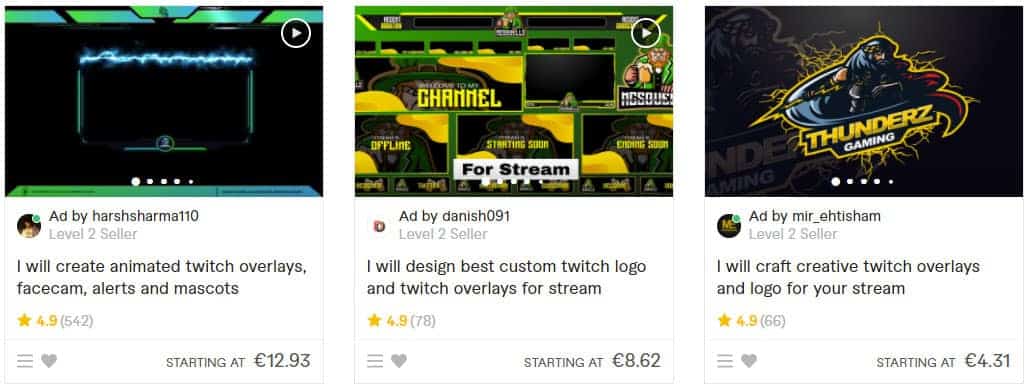 Twitch Overlays bekommt man auf Fiverr für rund 10 bis 40 Euro, der Preis hängt dabei von der Qualität und Erfahrung des Designers ab.