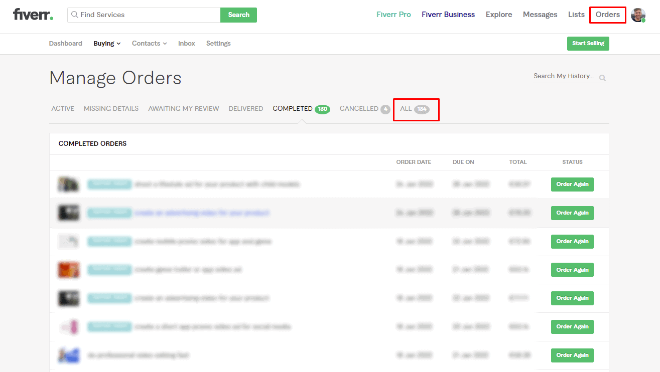 Jeden Kauf, den du auf Fiverr vornimmst, kannst du dir als Rechnung in PDF-Form herunterladen. Alle Käufe deiner Historie werden chronologisch dokumentiert und du findest diesen Bereich, wenn du oben rechts auf „Orders“ klickst, unten „Alle anzeigen“ auswählst und dann in der jeweiligen Order auf „Details“ und dann „Download Invoice“ klickst.
