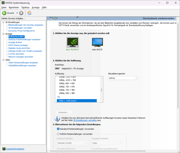 Haben wir diese Einstellungen vorgenommen wechseln wir im Programm auf der linken Seite zum Menüpunkt Auflösung ändern und klicken oben auf den Monitor. Dort stellen wir dann unter Auflösung die Auflösung ein welche mit (nativ) gekennzeichnet ist und die Aktualisierungsrate auf den größtmöglichen Wert. Das wiederholen wir dann für alle angezeigten Monitore. Zum Schluss beenden wir diesen Schritt wieder mit einem Klick auf „Übernehmen“ am unteren Fensterrand.